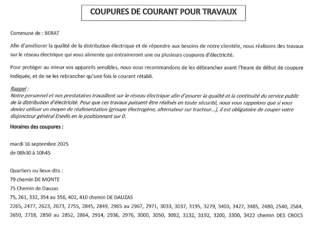 Coupures de courant pour travaux 16/09/2025
