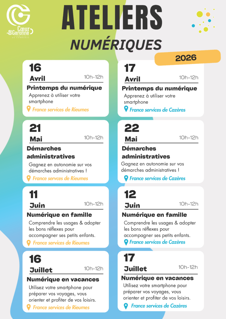 Dans le cadre de l’accompagnement au numérique proposé sur le territoire de la Communauté de communes Cœur de Garonne, des ateliers numériques seront organisés au sein des France Services de Cazères et de Rieumes.
